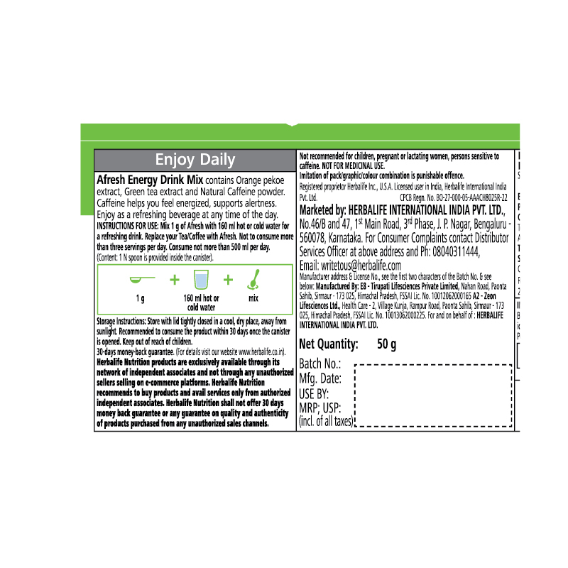 Enhance Your Energy Level!Afresh is a refreshing energy drink mix that contains orange pekoe extract, green tea extract and caffeine powder. Enjoy it hot or cold at any time of the day.