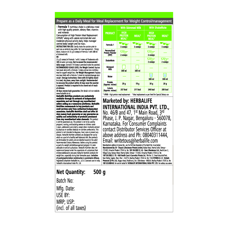For meal replacement – Simply blend, shake or stir 25 g (3 scoops) of Formula 1 with 300 ml of skimmed milk OR 25 g (3 scoops) of Formula 1 with 2 scoops of Shakemate with 300 ml water and enjoy.