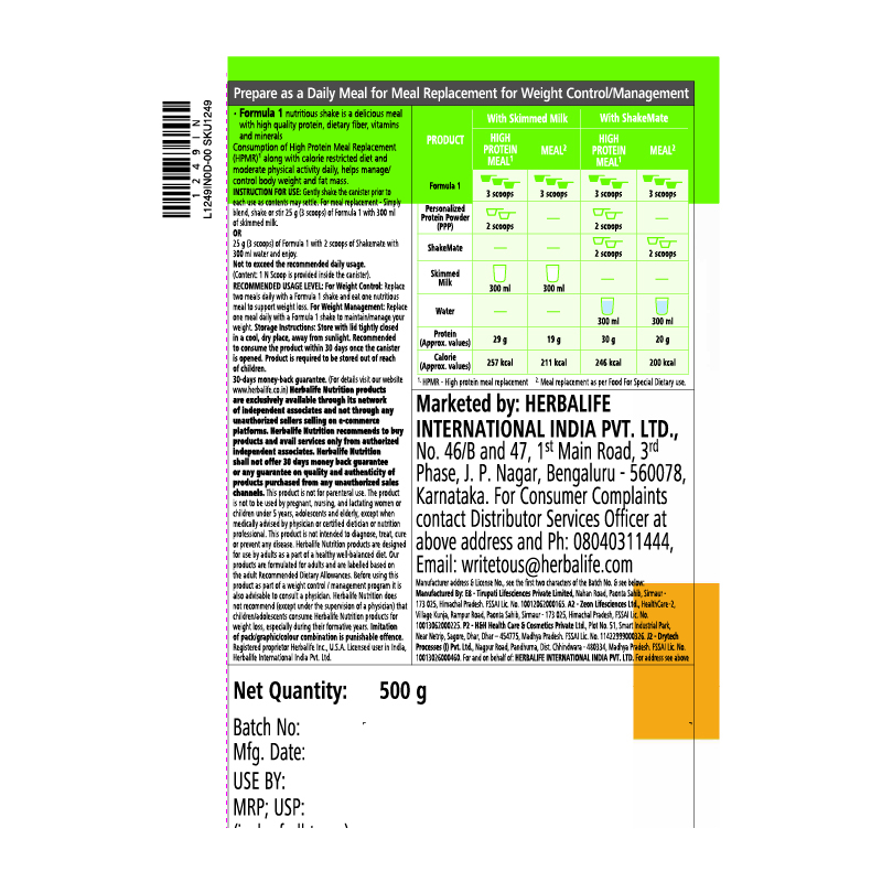 For meal replacement – Simply blend, shake or stir 25 g (3 scoops) of Formula 1 with 300 ml of skimmed milk OR 25 g (3 scoops) of Formula 1 with 2 scoops of Shakemate with 300 ml water and enjoy.