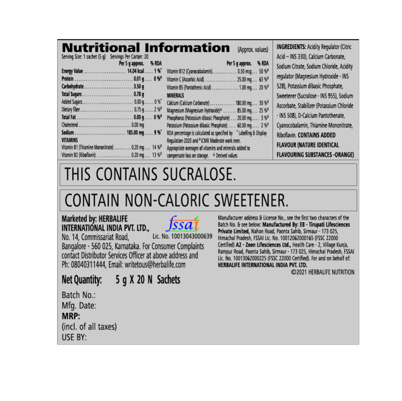 • It provides five essential vitamins (B1, B2, B5, B12 and C) and five essential electrolytes (calcium, magnesium,