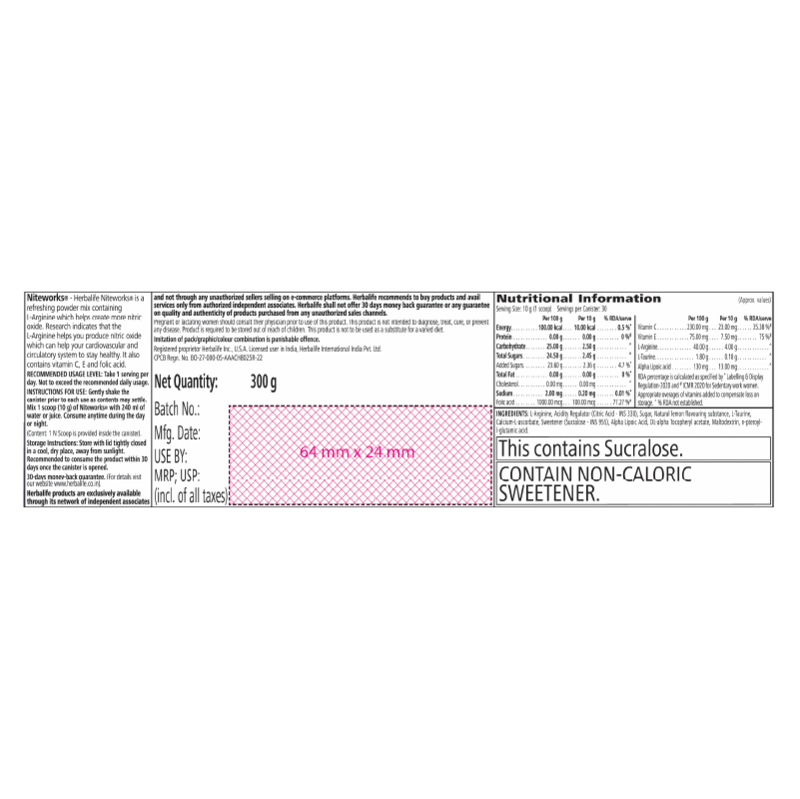 INSTRUCTION FOR USE: Gently shake the canister prior to each use as contents may settle. Mix 1 scoop (10 g) of Niteworks® with 240 ml of water or juice. Consume anytime during the day or night.